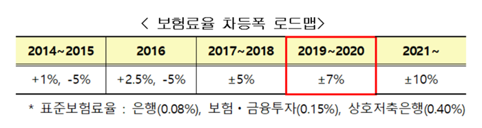 예보는 보험료율 차등폭을 2020년까지 ±7%로 유지한 뒤 2021년부터는 ±10%로 확대한다는 계획이다. 대신 보혐료율 산정을 위한 차등평가시스템의 평가지표 및 기준 등은 지난해와 같게 적용된다.