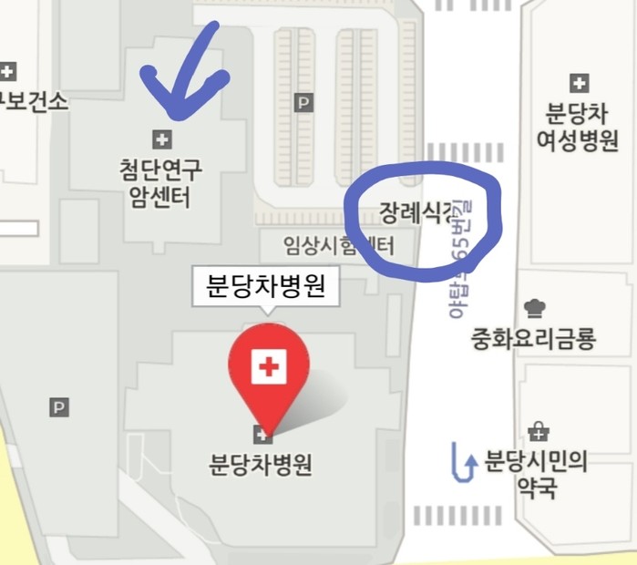 ▲ 구 분당경찰서 지하 유치장과 분당 차병원 영안실은 인접해 있었다. (화살표가 구 분당경찰서) |