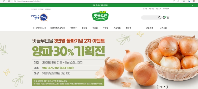이번 기획전은 무안 양파 소비 촉진과 맛뜰무안몰 회원 3만 명 돌파를 기념한 2차 행사로, 1인당 1매씩 제공되는 양파 30% 할인쿠폰을 통해 최대 1만 원까지 할인받을 수 있다.