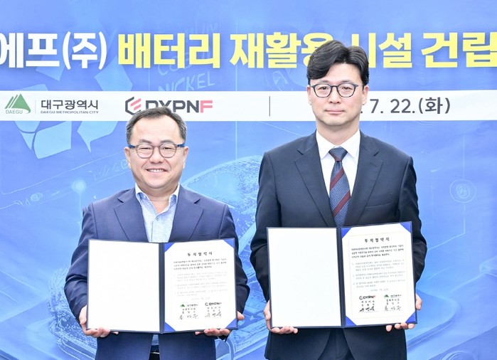 대구광역시는 7월 22일 산격청사 대회의실에서 디와이피엔에프㈜(대표 유병욱)와 달성 이차전지산업 순환파크 내 ‘사용 후 배터리 재활용 공장’ 신설 투자협약(MOU)을 체결했다.