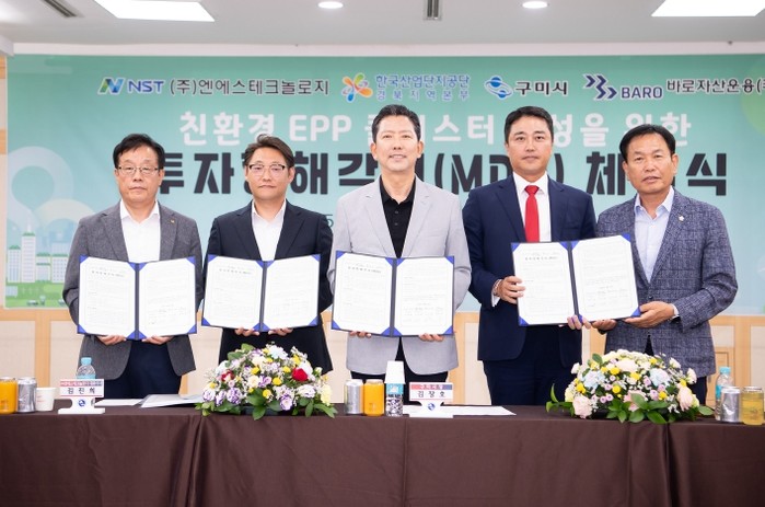 구미시는 8월 25일 시청 대회의실에서 ㈜NS테크놀로지, 한국산업단지공단 경북지역본부, 바로자산운용㈜과 함께 구미국가 3산업단지 내 ‘EPP(발포 폴리프로필렌) 클러스터’ 조성을 위한 투자양해각서(MOU)를 체결했다.
