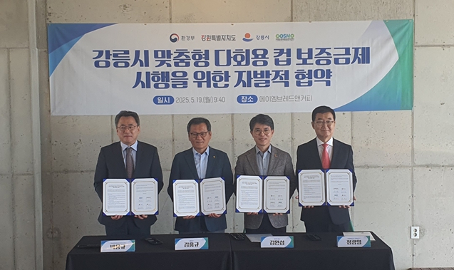강원특별자치도는 5월 19일 오전 9시 40분, 강릉시 ‘카페인 에이엠’에서 환경부, 강릉시, 자원순환보증금관리센터와 함께 ‘강릉시 맞춤형 다회용 컵 보증금제 시행 및 재사용 촉진’을 위한 자발적 협약을 체결했다고 밝혔다.