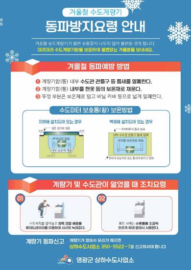 영광군 상하수도사업소에서는 수도시설 동파로 인한 주민불편 예방을 위해 겨울철 수도시설 동파 방지 대책 계획을 수립하고 수용가를 대상으로 수도계량기함과 옥내 급수관 보온조치 등 겨울철 수도계량기 동파방지를 위해 홍보하고 있다.