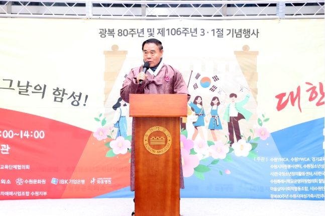 지속가능사회포럼에서 주최하고 수원청소년교육단체협의회 등 25개 단체가 주관하는 이날 행사는 이재식 의장, 장정희 기획경제위원장, 이희승 보건복지위원장, 채명기 환경안전위원장, 장미영 문화체육위원장, 김은경 예산결산특별위원장을 비롯한 수원특례시의회 의원, 독립운동가 후손, 시민 등이 참석하여 자리를 빛냈다.