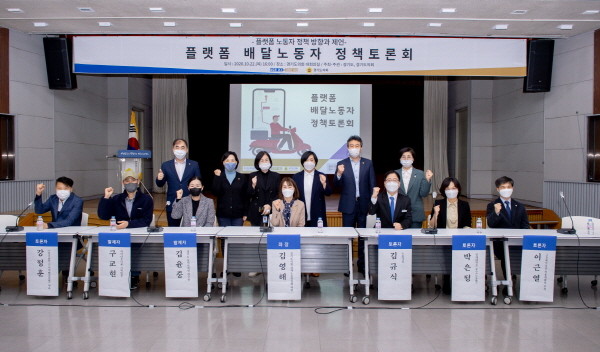 지난 10월 22일(목) 오후 4시, 경기도의회에서는 경제노동위원회(위원장 이은주, 더불어민주당, 화성6)와 경기도 노동국 공동주최로 “플랫폼 배달노동자 정책 방향과 제언”을 주제로 한 토론회가 개최되었다. 이 자리에는 경제노동위원회의 여러 의원뿐만 아니라 道 관련 부서 공무원, 지역 배달사업자, 근로복지공단 관계자, 플랫폼 노동자 등이 참석하여 열띤 토론을 벌였다.