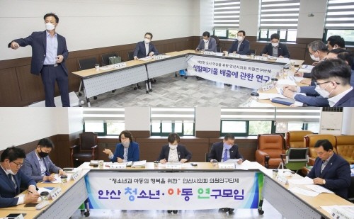 안산시의회 의원연구단체 ‘생활폐기물 배출에 관한 연구모임’과 ‘안산 청소년·아동 연구모임’이 1일 연이어 연구용역 착수보고회를 갖고 용역 관련 사항을 협의했다.