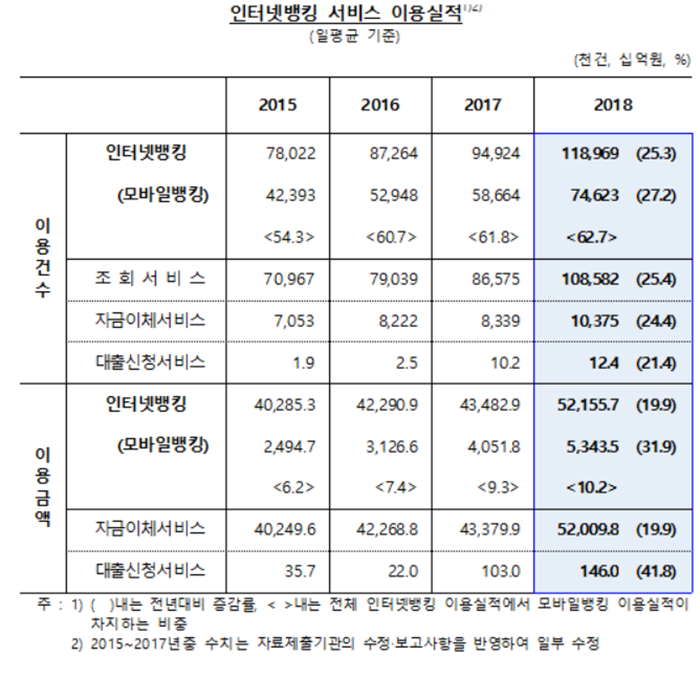 인터넷뱅킹을 통한 조회·자금이체·대출신청서비스 이용 건수 및 금액은 각각 1억1897만건, 52조1557억원으로 전년 대비 각각 25.3%, 19.9% 증가했다.