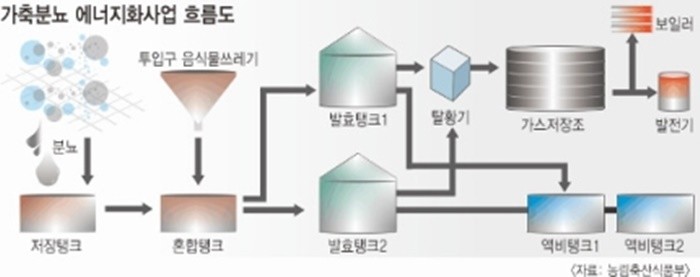 가축분뇨공동자원화사업은 2009년 시작됐다. 환경오염과 냄새로 골칫덩이였던 소똥, 돼지똥에 있는 바이오가스를 태워 전기를 만들고 부산물인 퇴비, 액비(액체비료)를 농경지에 환원하자는 취지다. 10년간 정부의 전폭적 지원으로 현재 95개 가축분뇨 공동자원화 시설에서 연간 347만t의 가축분뇨를 바이오에너지원으로 활용하고 있다.
