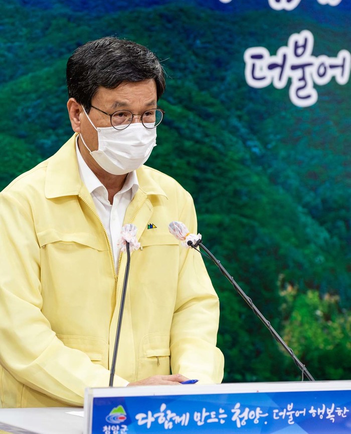| ▲ 김돈곤 청양군수가 코로나19 확진자 속출과 관련 사회적 거리두기 2단계와 개인생활수칙 철저 준수를 호소하고 있다. |