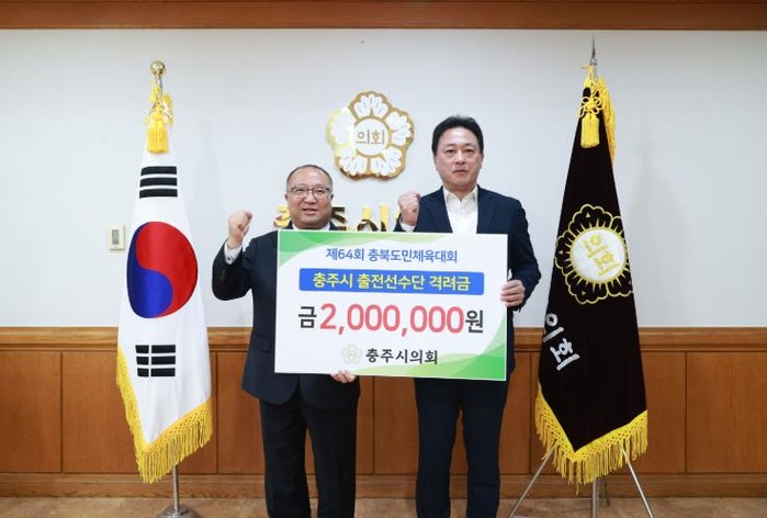 23일 충주시의회에서 제64회 충북도민체육대회와 제19회 충북장애인도민체육대회에 참가하는 충주시 선수단에 격려금을 전달했다.