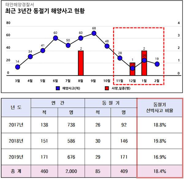 태안해경에 따르면, 올 겨울 찬 대륙성 고기압과 이동성 고기압의 주기적 영향으로 기온급강 등 해상변화가 클 것으로 전망되는 가운데, 최근 3년간 관내 해양조난사고 분석결과 전체 460척, 2천명 중 동절기 해당사고는 85척, 409명으로 18.4%에 달했고, 관련 사망·실종자 수도 전체 5명 가운데 3명, 60%를 차지해 동절기 해양조난사고 예방대응 안전관리 필요성이 높은 것으로 나타났다.