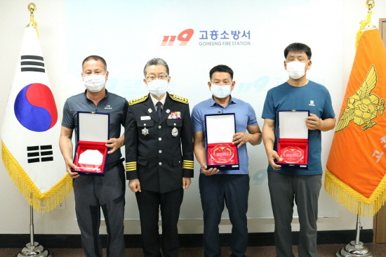 고흥소방서(서장 박상진)는 29일 소방서 소회의실에서 윤호21병원 화재 당시 인명구조 활동에 앞장서 소중한 생명을 구한 의인 5명에게 감사패를 수여했다.
