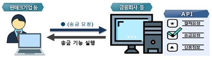 금융권의 오픈 API는 핀테크 기업이 금융회사가 공개형 API에 따라 미리 정한 명령어를 금융회사 시스템에 전송시키면, 그 시스템에서 지급결제·송금 등 기능이 실행되거나 관련 데이터를 받아볼 수 있다.