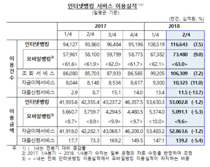 국내 은행의 인터넷뱅킹 등록고객 수는 1억4067만명으로 1분기(1억3814만명)보다 253만명(1.8%) 증가했는데, 이중 모바일뱅킹 등록고객만 9477만명에서 9977만명으로 500만명 늘어났다.