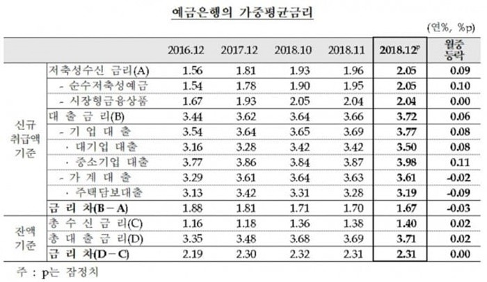 한국은행이 31일 발표한 `2018년 12월 중 금융기관 가중평균금리`에 따르면 지난달 예금은행의 신규취급액 기준 가계대출 금리(이하 신규취급액 기준)는 연 3.61%로 전월보다 0.02%포인트 하락했다.