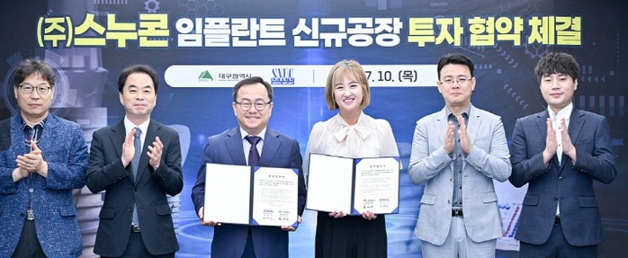 대구광역시는 7월 10일 대구광역시청 산격청사에서 임플란트 글로벌 강소기업인 ㈜스누콘(대표 박영우)과 치과용 임플란트 신규공장 2개소 건립을 위한 투자협약을 체결했다.