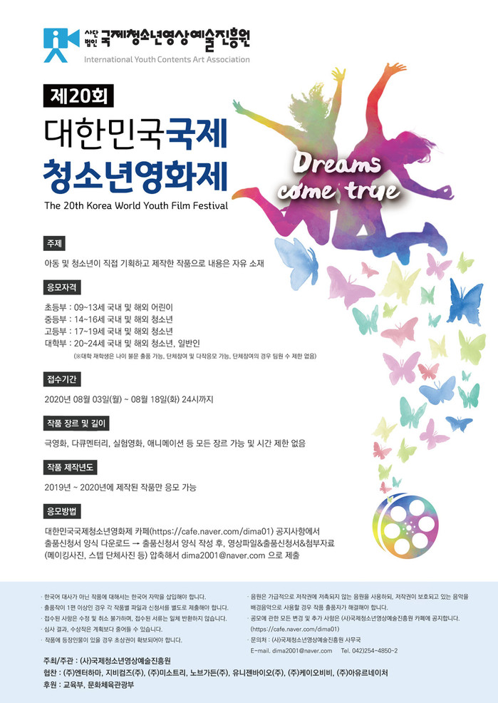 (사)국제청소년영상예술진흥원(이사장 김경우)이 주최하는 제20회 대한민국국제청소년영화제가 영상작품 공모를 오는 8월3일부터 18일 자정까지 접수한다.