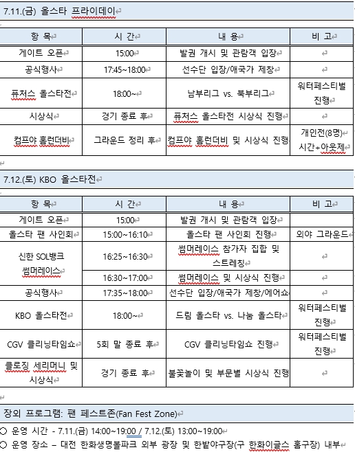 KBO는 대전 한화생명볼파크에서 11일(금) 개최되는 올스타 프라이데이와 12일(토) 펼쳐지는 KBO 리그 별들의 축제 ‘2025 신한 SOL뱅크 KBO 올스타전’ 행사 계획을 확정했다.