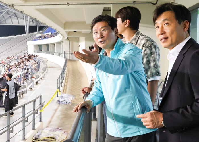 대한민국 남자 축구국가대표팀의 승리를 응원하기 위해 경기장을 방문한 이상일 시장은 경기장 시설을 직접 확인하고, 개선해야 할 사안들을 시 공직자들에게 주문했다.
