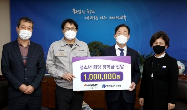 [프레스뉴스] 최정현 기자= 대전시교육청은 교육감실에서 16일 오전 10시에 한국타이어 그린피플 봉사단(회장 심영진)으로부터 청소년 희망장학금 100만 원을, 17일 오전 10시 30분에는 한국생산성본부 대전·세종·충청지역본부(CEO아카데미 총교류회장 황선영)로부터 800만 원을 기탁받았다고 밝혔다.