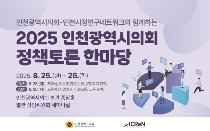 인천광역시의회는 시민의 행복과 더 나은 지역사회 발전을 위해 참신하고 다양한 정책 발굴 및 제안의 장인 ‘2025 인천광역시의회 정책토론 한마당’을 오는 25일부터 26일까지 이틀 동안 개최한다.