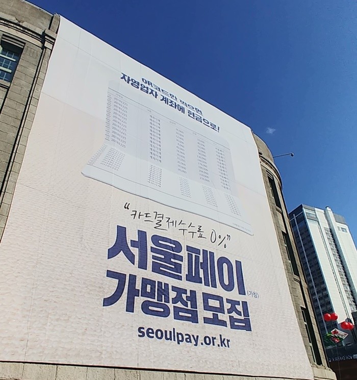 | ▲ 서울시청에 걸린 '제로페이 서울' 가맹점 모집 현수막. <사진=김혜리 기자> |