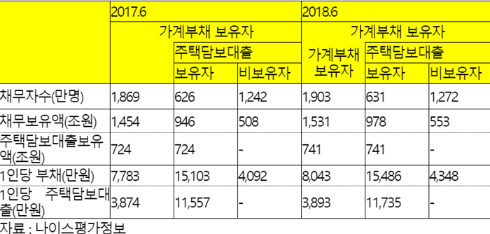 가계부채 보유자 중 자신의 집을 담보로 대출을 받은 이들은 631만명(33.2%)이었다. 이들의 부채총액은 978조원으로 전체 가계부채의 63.9%를 차지했다. 주담대를 받은 631만명 중 담보가 2건 이상인 다주택자는 130만명(20.5%), 담보가 1건인 1주택자는 502만명(79.5%)으로 빚을 내 주택을 산 5명 중 1명은 다주택자였다.