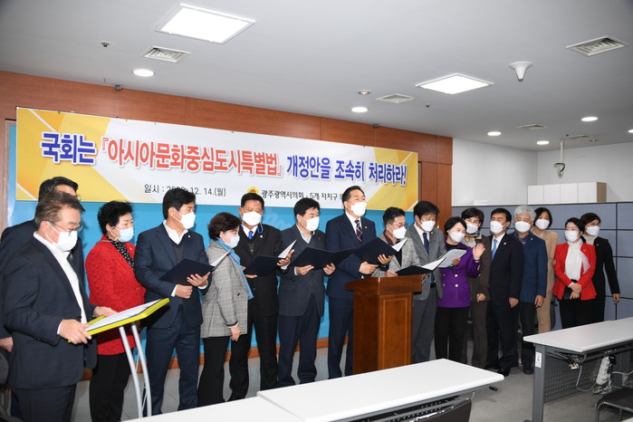 광주지역 지방의원 일동은 성명을 통해 “「국립아시아문화중심도시 조성에 관한 특별법」개정안이 지난 8월에 발의되어 국회 문화체육관광위원회 문화예술법안심사소위원회에 회부되었으나 지금까지도 전혀 진척이 없다”고 규탄했다.
