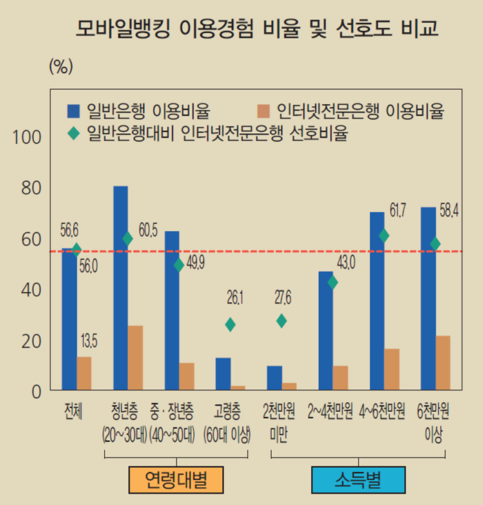 특히 인터넷전문은행의 모바일뱅킹이 일반은행의 모바일뱅킹보다 선호되는 것으로 나타났다.