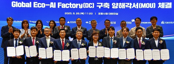 경상북도는 6월 26일 포항시청 대회의실에서 양금희 경상북도 경제부지사, 이강덕 포항시장, 김동훈 NHN 클라우드 대표, 박성빈 트랜스링크캐피탈(TransLink Capital) 대표, 안현덕 텐서웨이브코리아(TensorWave KOREA) 대표, 김태희 현대건설(주) 전무 등 100여 명의 주요 산․학․연 대표들이 참석한 가운데 ‘Global Eco-AI Factory 구축’을 위한 민·관 공동 업무협약을 체결했다.