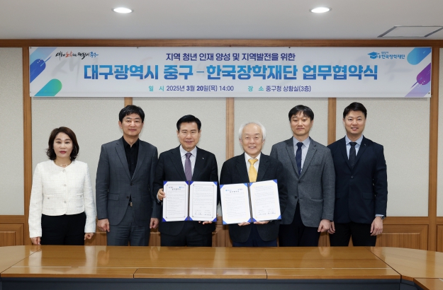 대구 중구는 20일 구청 상황실에서 한국장학재단과 지역 청년 인재 양성 및 지역 사회 발전을 위한 업무협약(MOU)을 체결했다.