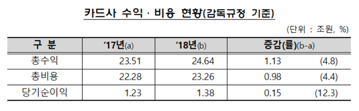 총당금 적립기준 강화로 인한 효과를 제외하면 감독규정 기준으로도 지난해 카드업계 순이익은 전년 대비 4.4% 감소했다.