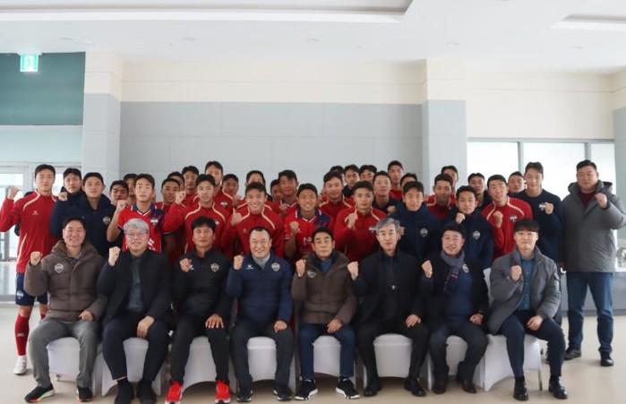 김천상무프로축구단 임직원 및 관계자와 김천시 체육회가 지난 2월 4일, 목포국제축구센터를 찾아 선수단을 격려했다.