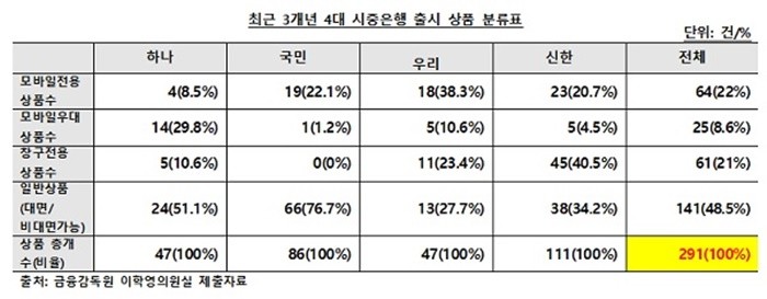 상품구성을 보면 4대 시중은행이 출시한 전체 상품 291개 중 모바일로만 가입이 가능한 모바일전용상품은 64개로 전체의 22% 수준이었다. 모바일 가입을 했을 때 우대금리 적용 등의 혜택을 부여하는 모바일우대상품은 25개(8.6%)이다.