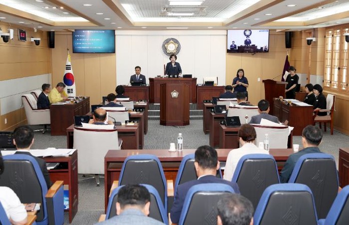 전재옥 의장은 개회사를 통해 최근 기록적인 폭우로 인한 피해를 언급하며 “신속한 복구를 위해 밤낮없이 애써주신 소방·경찰 등 유관기관 관계자와 현장을 지킨 공직자, 그리고 자원봉사자 여러분께 감사드린다”고 마음을 표했다. 이어 “어려움을 겪고 계신 군민 여러분께 위로의 말씀을 전하며, 더 이상의 피해없이 하루빨리 일상이 회복되길 간절히 바란다”고 덧붙였다.