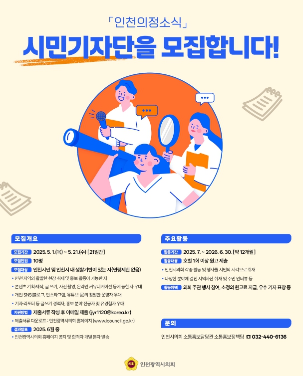 인천광역시의회에서 의정활동과 다양한 지역 소식을 전할 시민기자를 찾고 있다.