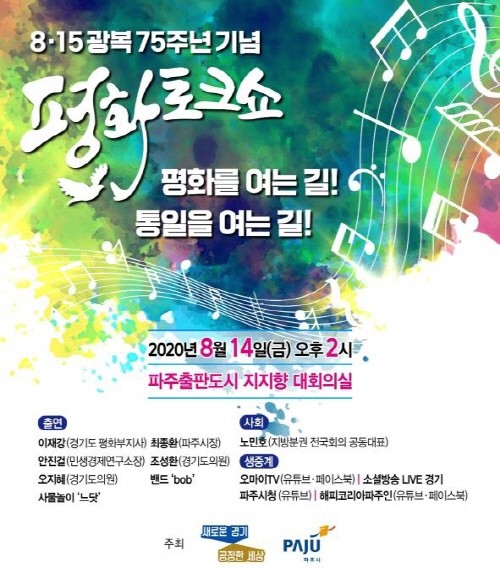 ‘평화를 여는길! 통일을 여는길!’을 주제로 경기도와 파주시가 공동으로 마련한 이번 평화토크쇼는 이재강 경기도 평화부지사, 최종환 파주시장, 조성환, 오지혜 도의원, 안진걸 민생연구소 소장 등이 패널로 참석하며 노민호 지방분권 전국회의 공동대표가 사회를 맡는다.