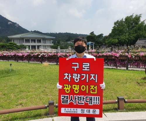 경기도의회 기획재정위원회 정대운(더민주)위원장과 광명시 이일규, 한주원 의원과 함께 8일(수) ‘구로차량기지 광명이전 즉시 중단’을 촉구하며 청와대 앞에서 1인시위에 나섰다.
