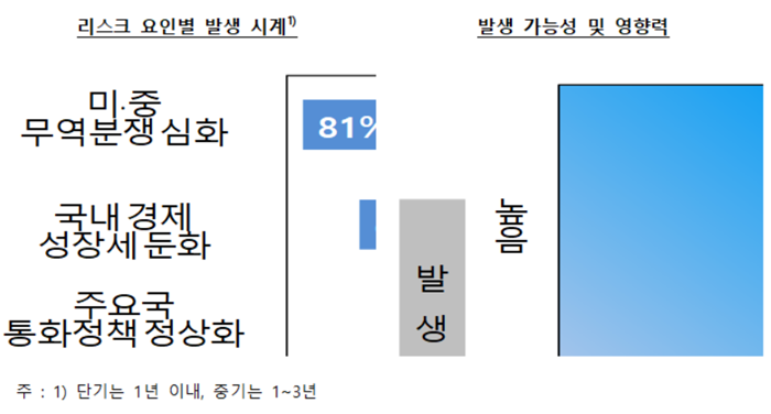응답자들은 미·중 무역분쟁 심화는 1년 이내 발생할 단기 리스크로 인식했다. 이어 국내 경제 성장세 둔화, 중국 금융·경제 불안 및 가계부채 누증 등은 3년 이내 발생할 중단기 리스크로 평가했다.