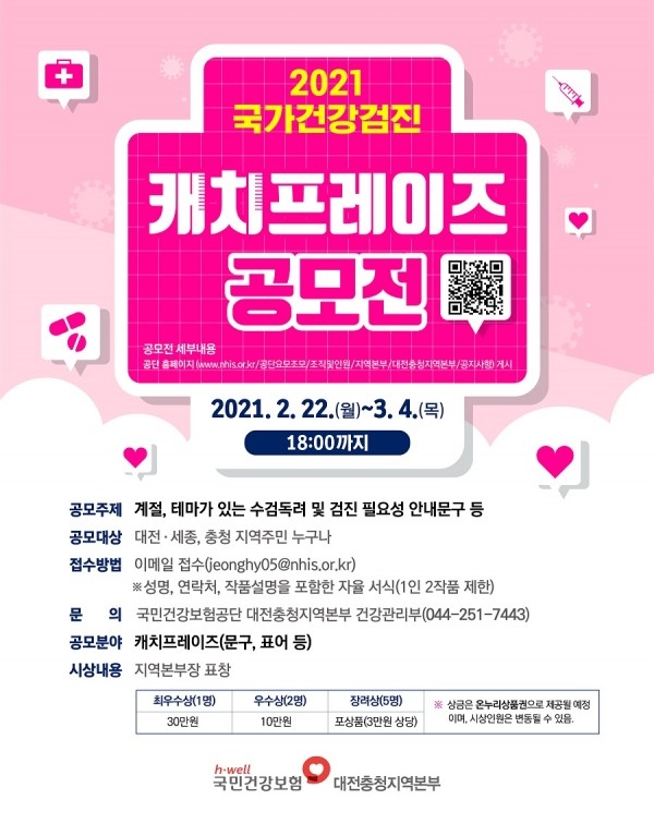 [프레스뉴스] 최정현 기자= 국민건강보험공단 대전충청지역본부는 국민의 검진에 대한 관심 제고와 자발적 검진 참여 문화를 형성하기 위해 22일부터 3월 4일까지 ‘캐치프레이즈’ 공모전을 개최한다.