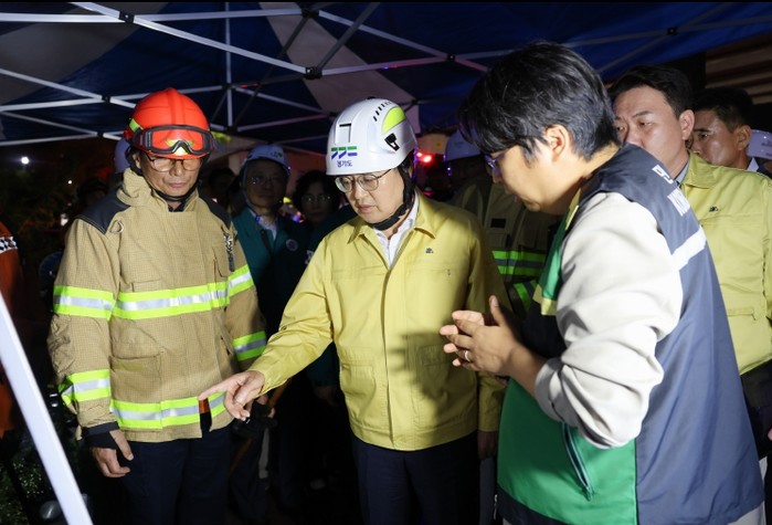 ▲ 16일 오후 김동연 경기도지사가 오산 가장교차로 옹벽 붕괴 사고 현장방문해 구조팀에 인명구조를 최우선으로 하라는 지시사항을 전달하고 있다. |