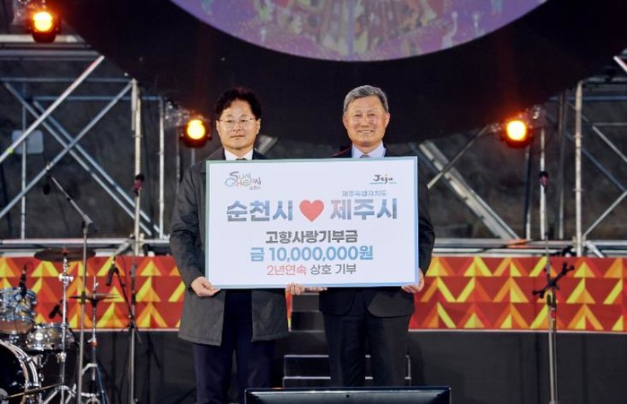 순천시와 제주시는 지난 14일 제주들불축제 개막식이 열린 새별오름에서 고향사랑기부금 상호 기탁식을 가졌다고 밝혔다.