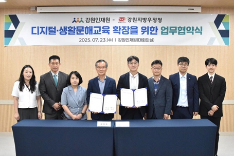 강원인재원과 강원지방우정청은7월 23일, 강원인재원 대회의실에서 디지털 및 생활문해교육의 지속적인 확장과 공동협력을 위한 업무협약을 체결한다.