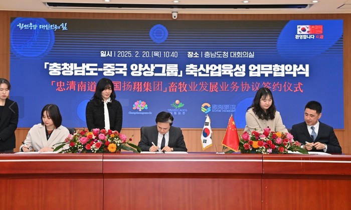 김태흠 지사는 20일 도청 대회의실에서 양쓰팅 광시 양샹그룹 총회장, 장옌 심천 수잉과학기술유한회사 회장과 축산업 육성을 위한 업무협약을 체결했다.