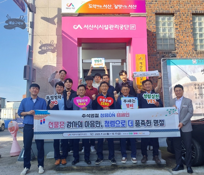 서산시시설관리공단은 다가오는 추석 명절을 맞아 건전하고 투명한 조직문화를 확립하기 위해‘청렴ON 캠페인’을 9월 22일부터 10월 17일까지 운영한다고 밝혔다.