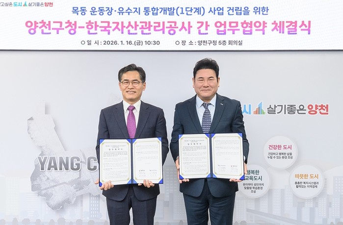 양천구가 1월 16일 한국자산관리공사와 업무협약을 체결하며, 목동운동장·유수지 일대 통합개발(목동MICE)을 위한 첫걸음을 내디뎠다.