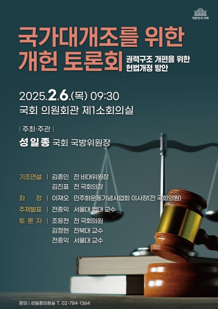국회 국방위원장을 맡고 있는 성일종 국회의원 ( 국민의힘 , 충남 서산 ‧ 태안 ) 은 2 일 “ 권력구조 개편 등 헌법개정 논의를 본격화하기 위해 , 6 일 오전 9 시 30 분 국회 의원회관 1 소회의실에서 ' 국가대개조를 위한 개헌 토론회 ' 를 개최한다 " 고 밝혔다 .