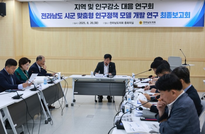 전라남도의회 ‘지역 및 인구감소 대응 연구회’(대표의원 이현창)는 8월 26일 도의회 중회의실에서 '전라남도 시군 맞춤형 인구정책 모델 개발 연구' 최종보고회를 개최했다.
