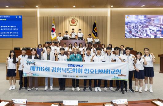 경상북도의회는 8월 14일 본회의장에서 영덕 영해중학교 학생 28여명이 참여한 가운데 『제116회 경상북도의회 청소년의회교실』을 개최했다.
