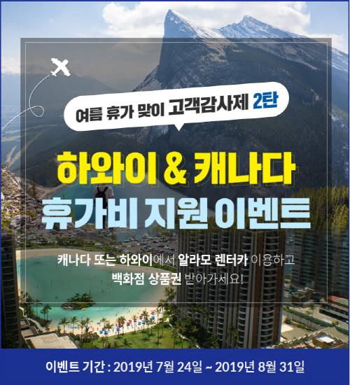 알라모렌터카 한국총판은 본격적인 여름 휴가 시즌을 맞아 하와이, 캐나다 여행객을 위한 ‘휴가비 지원 이벤트’를 실시한다고 밝혔다.